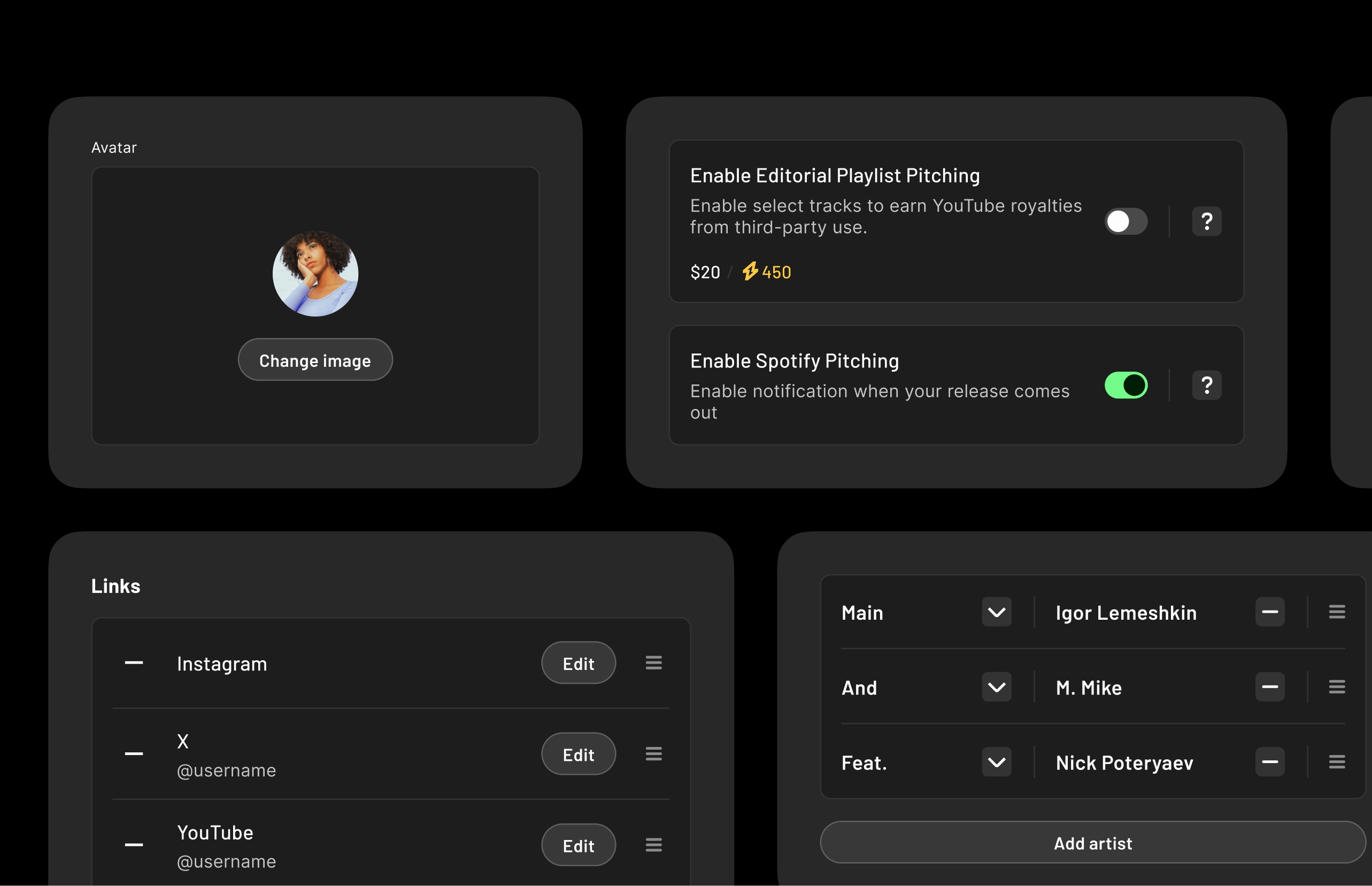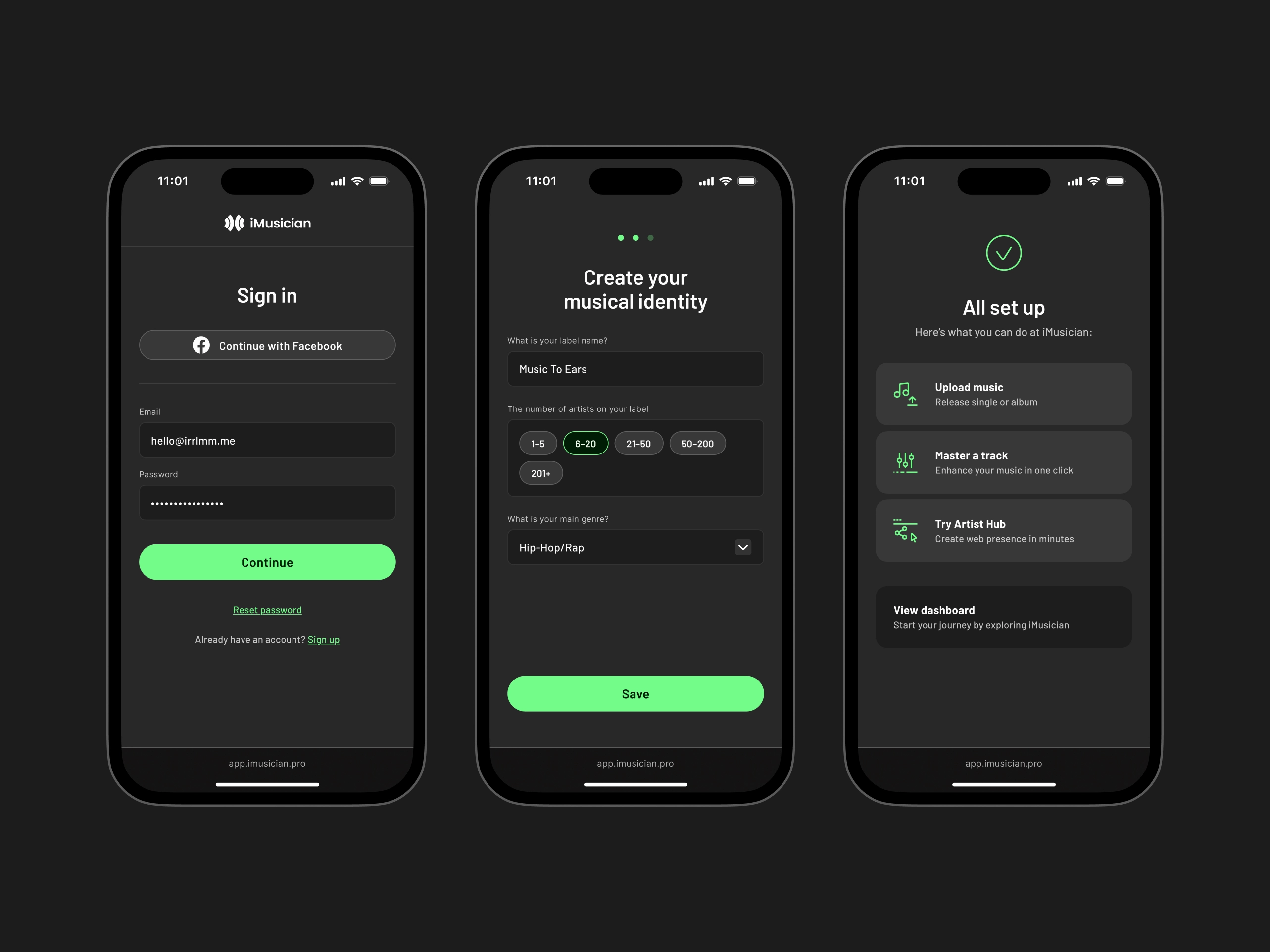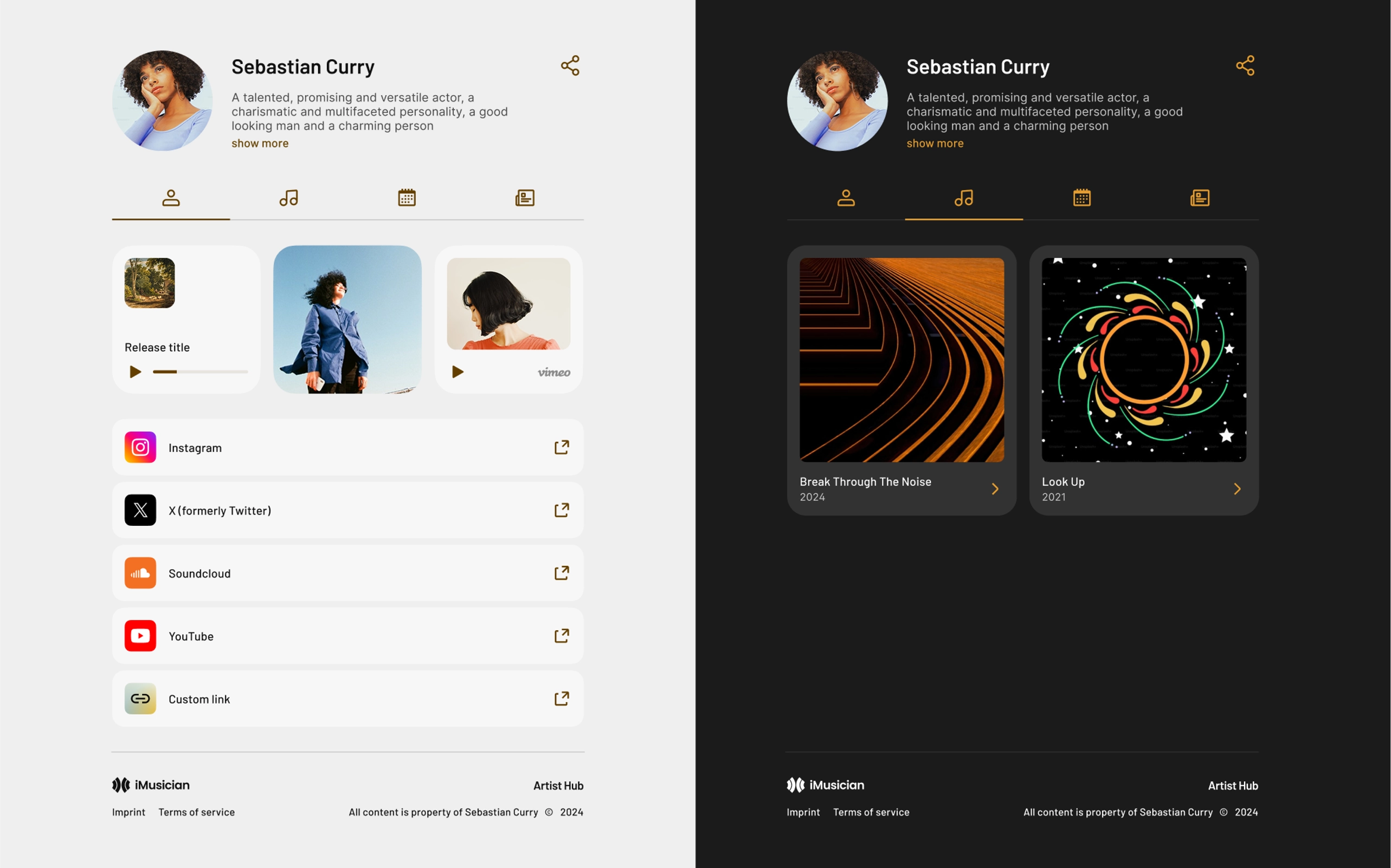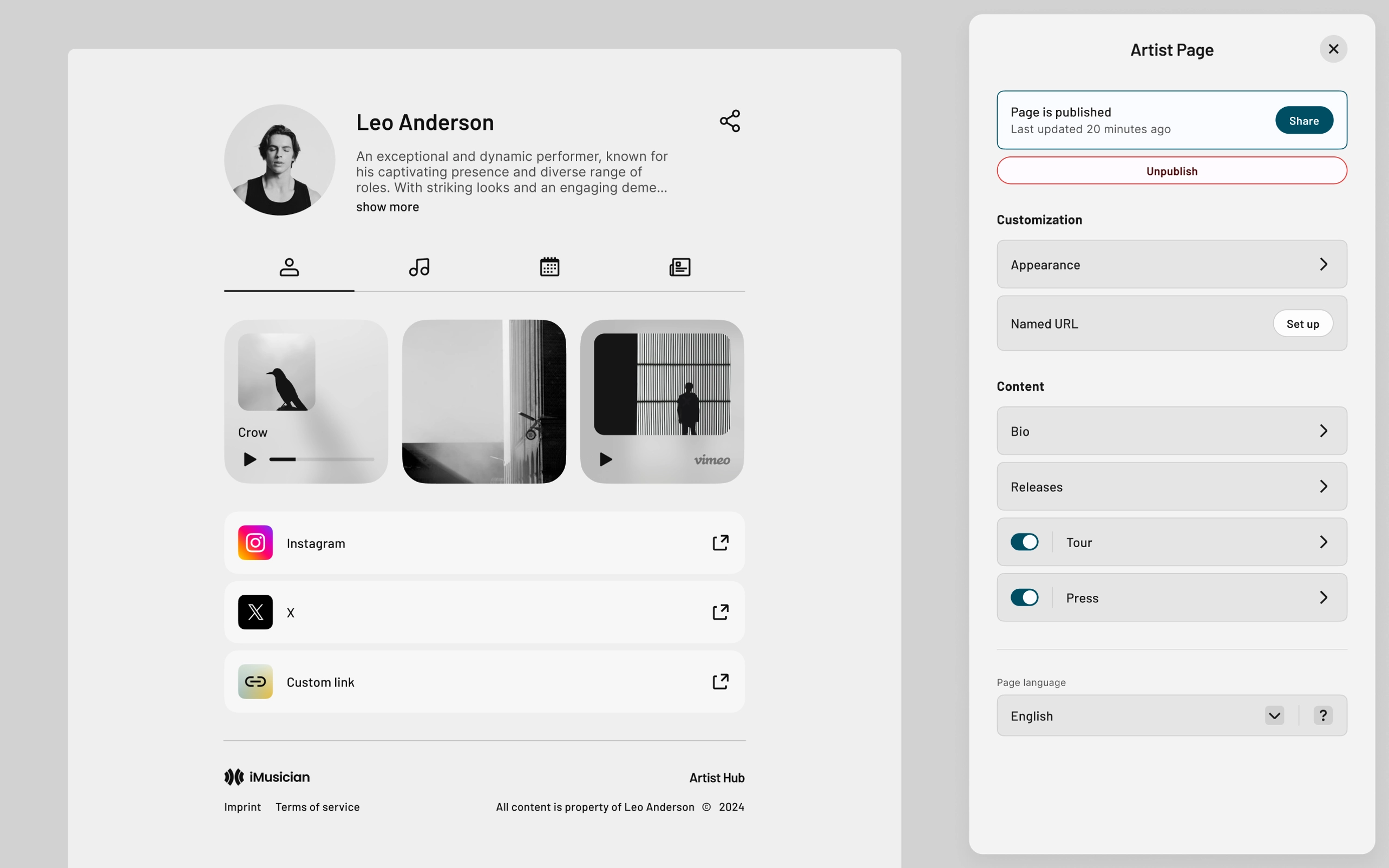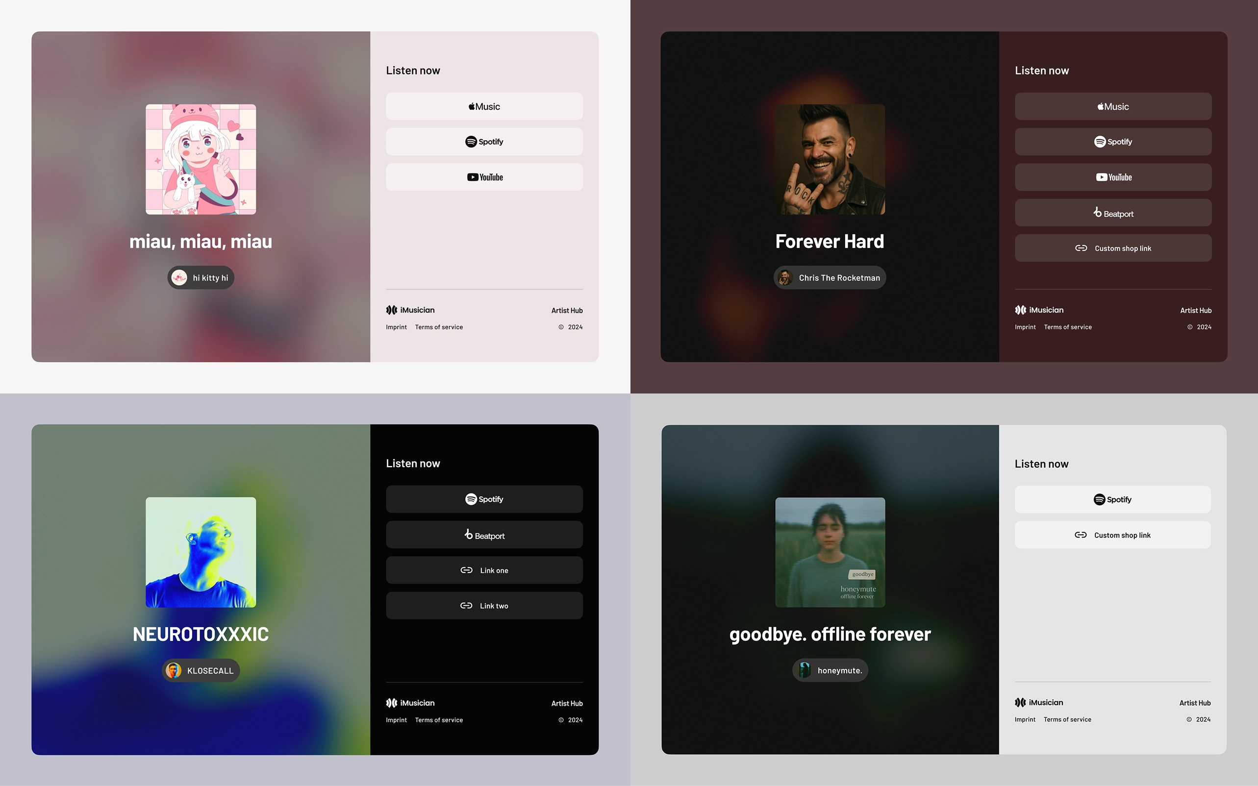 iMusician's Artist Hub is a series of website generators for artist profiles and release pages, designed for 1-click setup, customization and smart data aggregation.